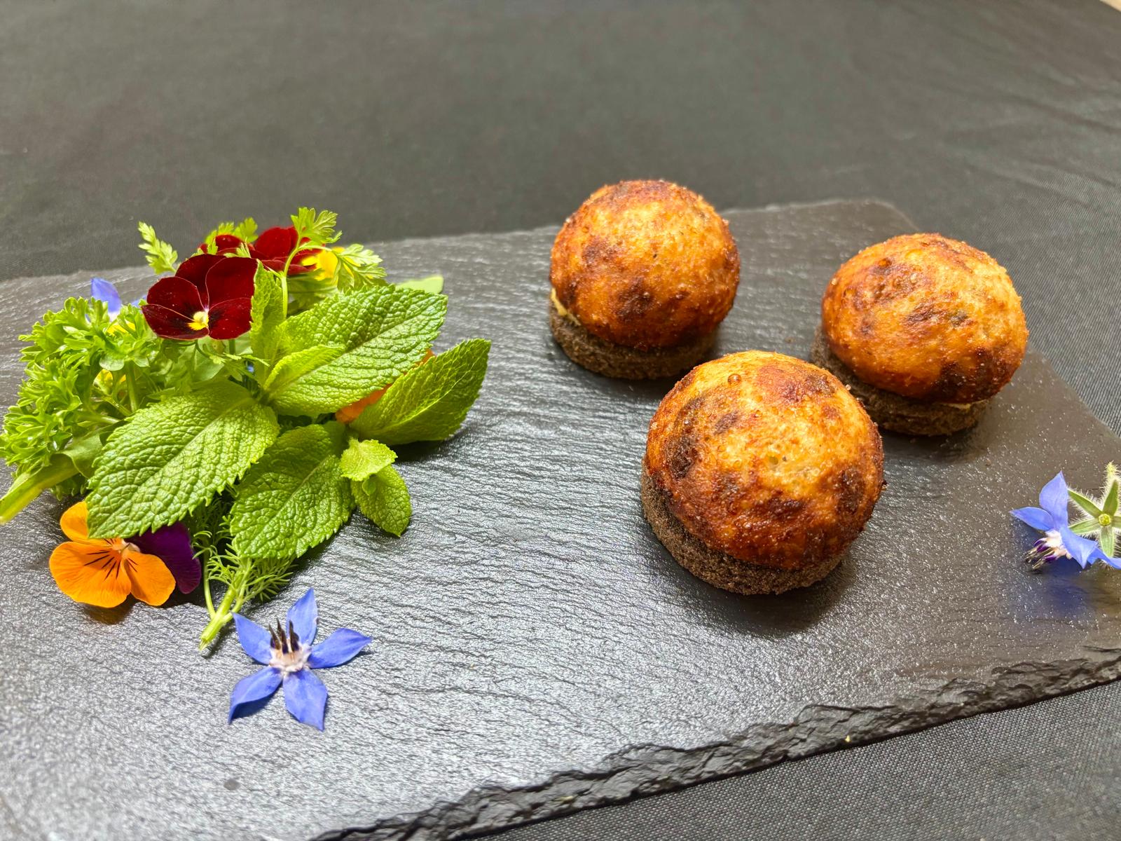 Beignet de fromage de 50g au Gruyère, emmental, Fontal et raclette, noix, raisin blond, œufs, farine et vin blanc sur une tranche de pain de mie croustillante au malt et cacao